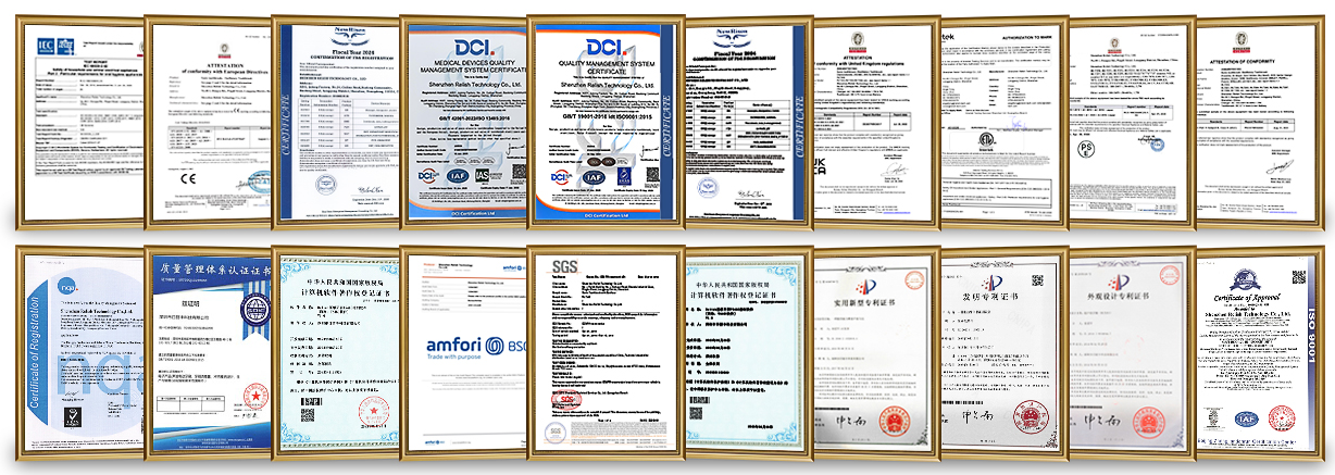 Certified to ISO 9001 & ISO 13485, with 23 inspection procedures and 100% pre-shipment QC. All products meet CE, FCC, RoHS, FDA registration standards.