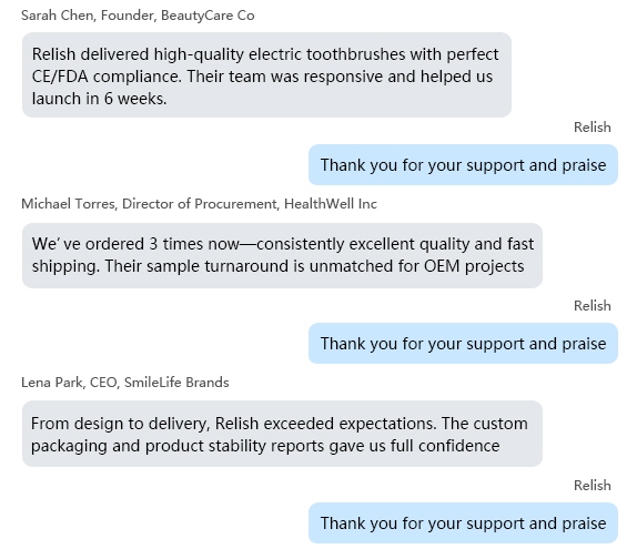 At Relish, our team is composed of elite engineers, certified testing experts, and dedicated customer service professionals—each driven by a shared passion for oral care innovation. For us, it’s not just a job—it’s a mission to deliver exceptional quality, cutting-edge design, and reliable manufacturing excellence.